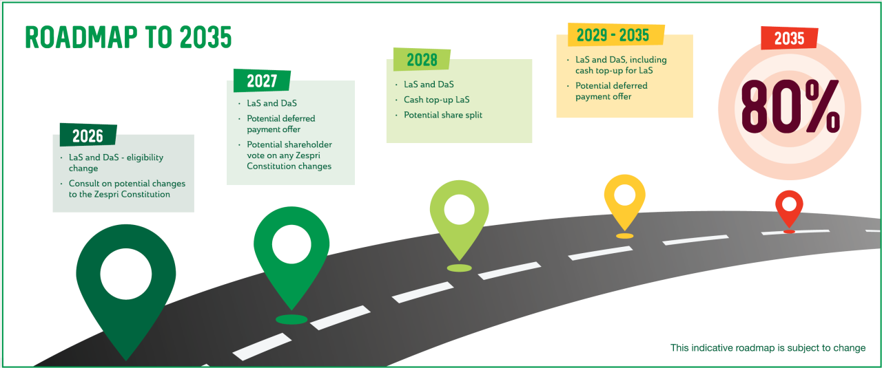 | Change LaS and DaS eligibility from 2026 | LaS and DaS will go ahead in May 2026, but eligible participation will be capped to those who have one share or less per tray of production. Historical production is the average of the two highest yearly production figures of the five most recently completed seasons. Please refer to the Product Disclosure Statement for an offer of ordinary shares in Zespri Group Limited available [here] . LaS and DaS Offer documents for 2026 will be available in May. |